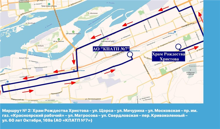 Маршрут № 2: Храм Рождества Христова — ул. Щорса — ул. Мичурина — ул. Московская — пр. им. газ. «Красноярский рабочий» — ул. Матросова — ул. Свердловская — пер. Кривоколенный — ул. 60 лет Октября, 169а (АО «КПАТП № 7»)