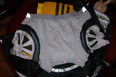 Короче говоря, трусам, дамы и господа, можно смело ставить зачет. Да и вообще! Предлагаю ввести новую моду: вместо брелоков для ключей, обозначающих марку машины, владельцем которой вы являетесь, предлагаю надевать трусы с фирменной символикой! Правда, перед всеми подряд