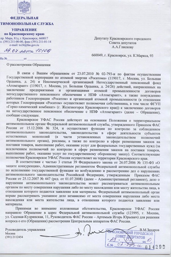 1. УФАС по Красноярскому краю переслало мое обращение по подведомственности в Москву, ждем ответа оттуда.