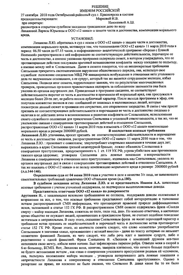 Очередное позорище. Бывший следователь вознамерился взыскать 2 миллиона с соседа-инвалида. Виной всему стал сюжет на телевидении, куда инвалид обратился за защитой. В течение нескольких лет он был вынужден терпеть загулы неуравновешенных соседей и по совместительству работников милиции. В ответ на жалобы получил уголовное дело об угрозе убийством... бутылкой. Спасла инвалида от посадки только судмедэкспертиза, показавшая, что своими протезами выполнить подобных действий он не мог.