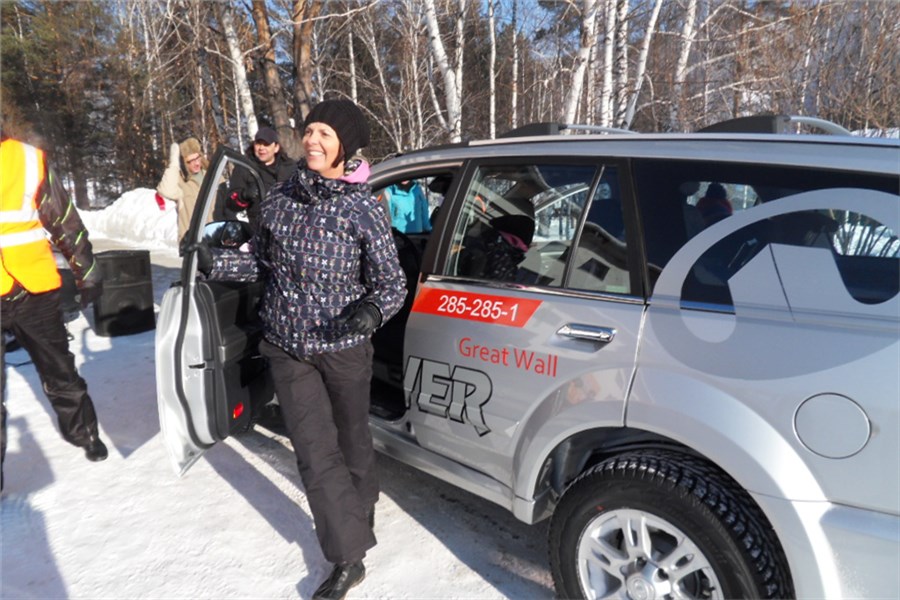 Еще меня позабавил тест-драйв китайских внедорожников Great Wall. Как выяснилось, в женской дивизии только 3 дамы умели ездить на механике. Я и штурман (ведущая «Деталей» Анна Прохорова) помчались по заснеженным склонам. Нужно было проехать круг, обогнув ледяной фаллос («зачет» организаторам за юмор). А вот от автомобиля я не в восторге. Машина напомнила нашу «Ниву». Хотя, может мне так после моего спорт-кара показалась? Известный красноярский гонщик Александр Подольский справился с заданием очень лихо.