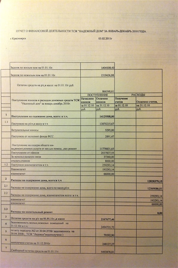 Очередной образец предвыборной агитации от правления ТСЖ «Надежный дом» - отчет о финансовой деятельности за 2010 год. Эти же цифры озвучивались и на собрании 4 февраля. Что интересно: