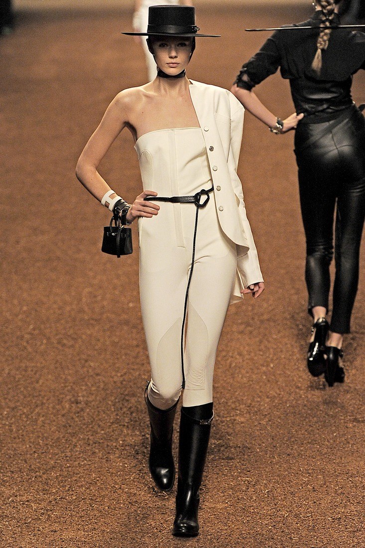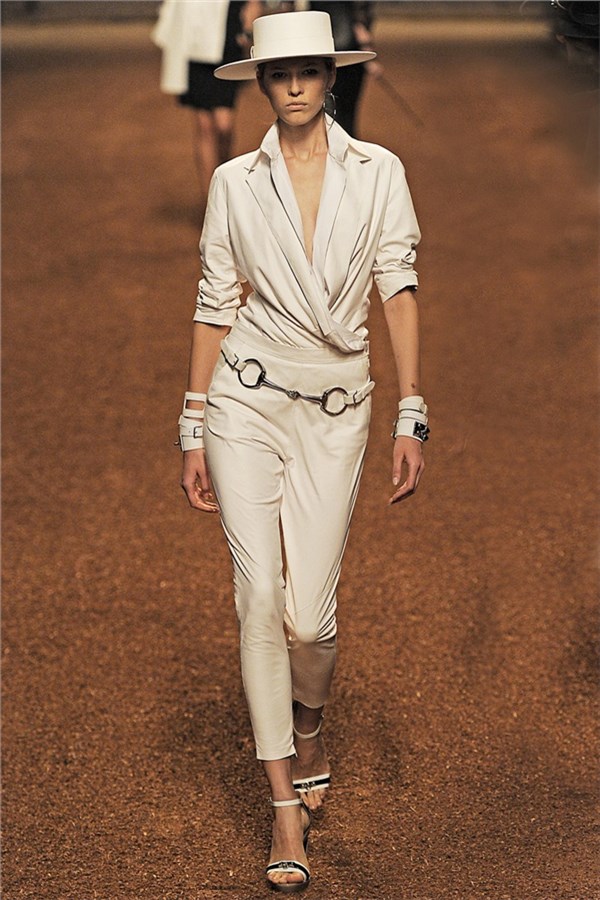 Hermes, один из моих самых любимых брендов, представил в Париже коллекцию весна -лето 2011, в которой смог ярко продемонстрировать свой основной профиль - производство конной сбруи - в вечерних платьях и строгих костюмах. Пояс, напоминающий хлыст, пряжка в виде уздечки с трензелем придают изящность строгому силуэту. Брюки с коленной леей, сапоги и перчатки - все эти атрибуты элегантного образа ни что иное, как амуниция всадника.