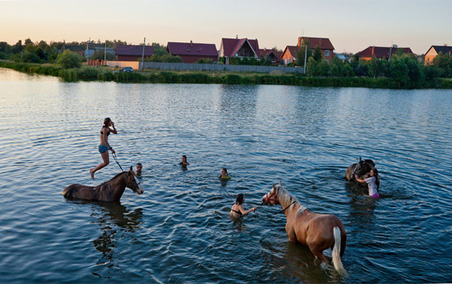 «Русское лето» — эдакий широкоугольный взгляд Бендиксена на страну, которую он давно знает. В серии странный, но и привычный для нас сплав контрастов: поэтичности и серости, понтов и убогости, чего-то старорусского и совкового. Наверное, поэтому серия интересна энциклопедически, но во что-то единое не склеивается. Мне очень нравятся самые поэтичные, эдакие «деревенские» кадры, хоть они сюжетно не новы. Но уж фотографический привет «Купанию красного коня» Петрова-Водкина, деревенские пляски у костра и ночной обрядовый сюжет — и правда красиво.