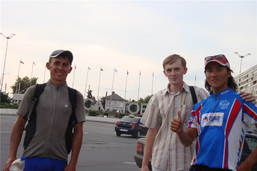 На берегу у моста, в Саратове, нас ждал Сергей. Он звонил еще задолго до того, как мы должны были приехать, и хотел встретиться с нами. Подобные встречи очень бодрят и заряжают. Он проводил нас на пляж, где мы установили палатки. Хочется выразить огромную благодарность Сергею за содействие в поиске места для ночлега, с которым у нас постоянно возникают проблемы в крупных городах, и врученные им фрукты, которые очень пришлись кстати с дороги. Сергей следил за подготовкой велотура еще с марта месяца, и ему было очень интересно: получится ли у нас задуманное? Пока вроде получается.