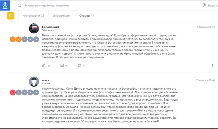 Достается и фотографу-хозяйке студии: ее обвиняют в непрофессионализме, хамстве и равнодушии к посетителям. Ещё красноярцы жалуются на то, что отрицательные отзывы в группе студии удаляют, а самих авторов банят. Впрочем, есть и те, кто пишет восторженные отзывы, и их довольно много.