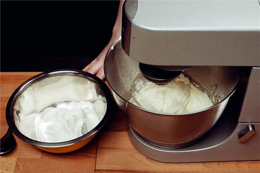 4. Для крема берем сухие сливки «Сопьо Крима» в пропорции 1:1 с водой или оставшимся молоком. Понадобится 75 г готовых сливок. Слегка охладим, чтобы продукт загустел. Смешиваем сливки с маскарпоне и сахарной пудрой. Взбиваем миксером.