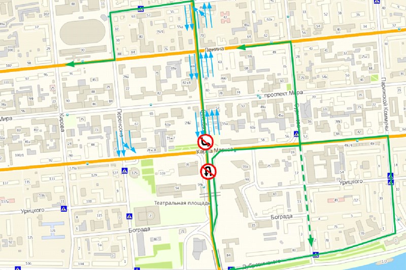 Запрет поворота на Маркса - вполне ожидаемо, но вот сужение и так загруженного въезда до 2х полос? Это перебор, учитывая что Вейнбайма наполняется и с Мира и с Ленина, особенно с Ленина автобусами - они будут блокировать к чертям проезд через Ленина и ситуация с пробками будет ужасной.