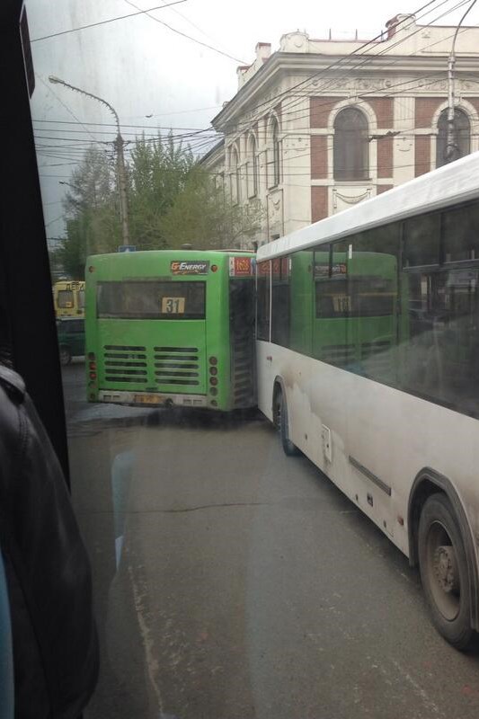 Из фотографии не все ясно! Нужно уточнить по своим ли полосам двигались автобусы, в том числе и осуществляли поворот. Ведь если бы все ехали по своим полосам, аварии бы не было