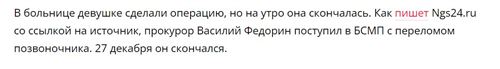 По девушке, селезенку удалили, печень зашивали, печень штука такая, выживаемость очень низкая... Если бы просто кости, то да, собирают травматологи как конструктор ЛЕГО кости, но печень... По прокурорскому, в больничке и тромб оборвался, странно это и что не откачали... Бывает оторвётся тромб, так и скорую вызвать успевают и скорая привозит и осмотрят и потом экстенно тромб перехватят... А тут... Очень странно. Чисто теоритически, в качестве версии могли медики наказать за смерть коллеги. Тем более по слухам вел себя пьяный он в больничке по хамски. Мог какой то укол справоцировать отрыв тромба? Прокурорские тоже сейчас начнут медиков проверять, как почему тромб оторвался, проверять и искать нарушения и возбуждать уголовные дела на медиков.