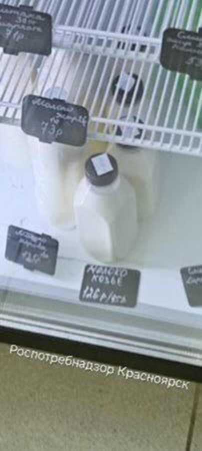 Красноярец пожаловался в Роспотребнадзор на магазин «Роклан мясные традиции» на ул. Академика Киренского из-за коровьего и козьего молока неизвестного происхождения, упакованного в пластиковые бутылки объёмом 1 л и 0,5 л без какой-либо маркировки.