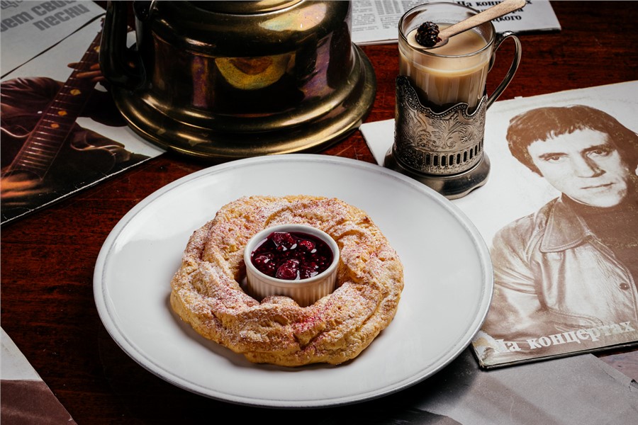 Заварной калач с малиновым вареньем. Владимир Семенович был настоящим ценителем чая и даже собирал различные его сорта. В дополнение на столе часто были простые, но вкусные угощения. По рекомендации шефа, воздушный заварной калач вкуснее всего отламывать руками и обмакивать в густое домашнее варенье.
