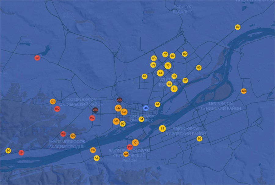 Во всех районах города датчики их системы экомониторинга сменили голубой цвет на небезопасные желтый и оранжевый, а местами — опасные красный и черный.