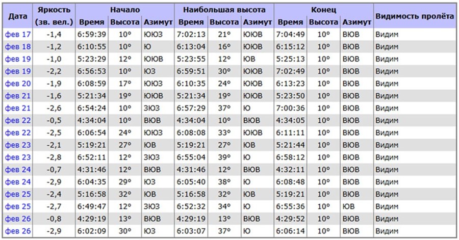 Расписание некоторых пролетов МКС в феврале можно посмотреть в таблице.