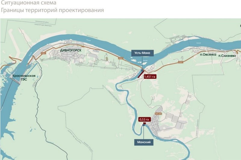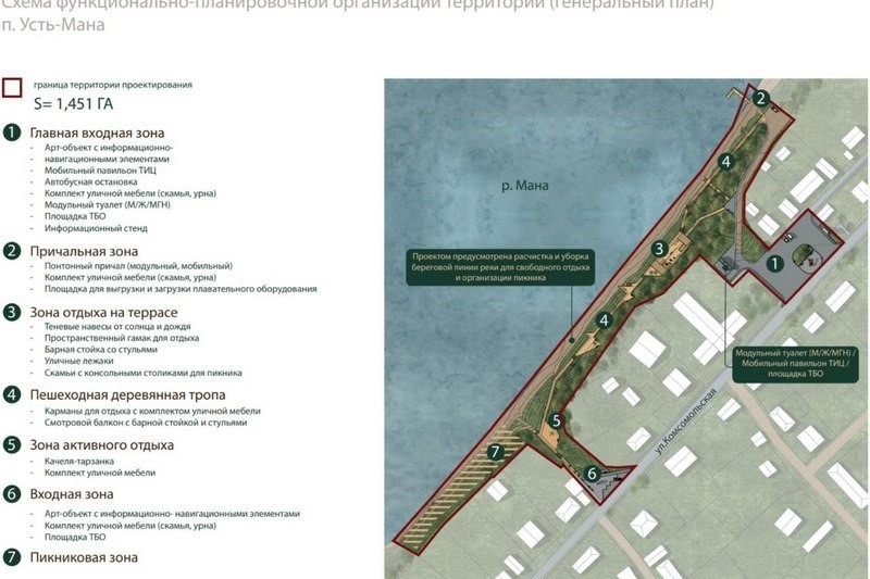 Первая зона отдыха появится на берегу Маны в районе моста. Там установят уличные лежаки, гамак, теневые навесы, скамьи со столиками для пикника и смотровой балкон, где разместится барная стойка со стульями. Граница проектирования — 1,451 га.
