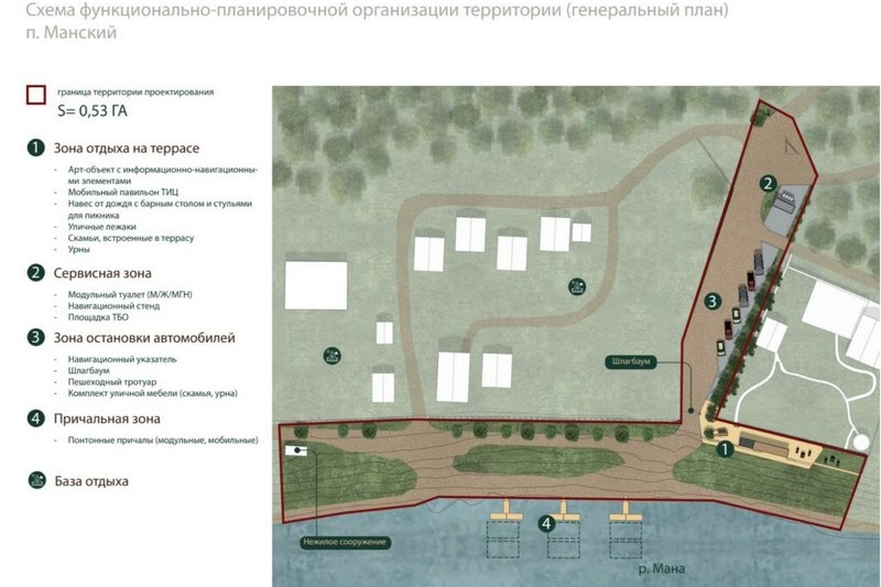 Еще одну зону площадью оборудуют рядом с поселком Манский. Здесь появится навес от дождя с барным столом и стульями для пикника, уличные лежаки, встроенные в террасу скамьи и понтонные причалы. Неподалеку расположена база отдыха. Граница проектирования — 0,53 га.