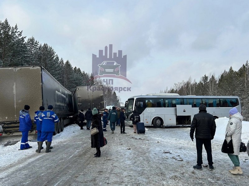 Как рассказали в Госавтоинспекции, авария произошла утром 13 февраля на 744 км федеральной трассы Р-255 «Сибирь». По предварительным данным, водитель грузовика «Фредлайнер» ехал в сторону Ачинска, когда врезался в остановившийся автобус «Хендай» под управлением 48-летнего водителя. После этого автобус столкнулся с автомобилями «Ниссан» и «Рено». В это время во «Фредлайнер» врезался другой грузовик «Донг Фенг». Обе фуры съехали в кювет.