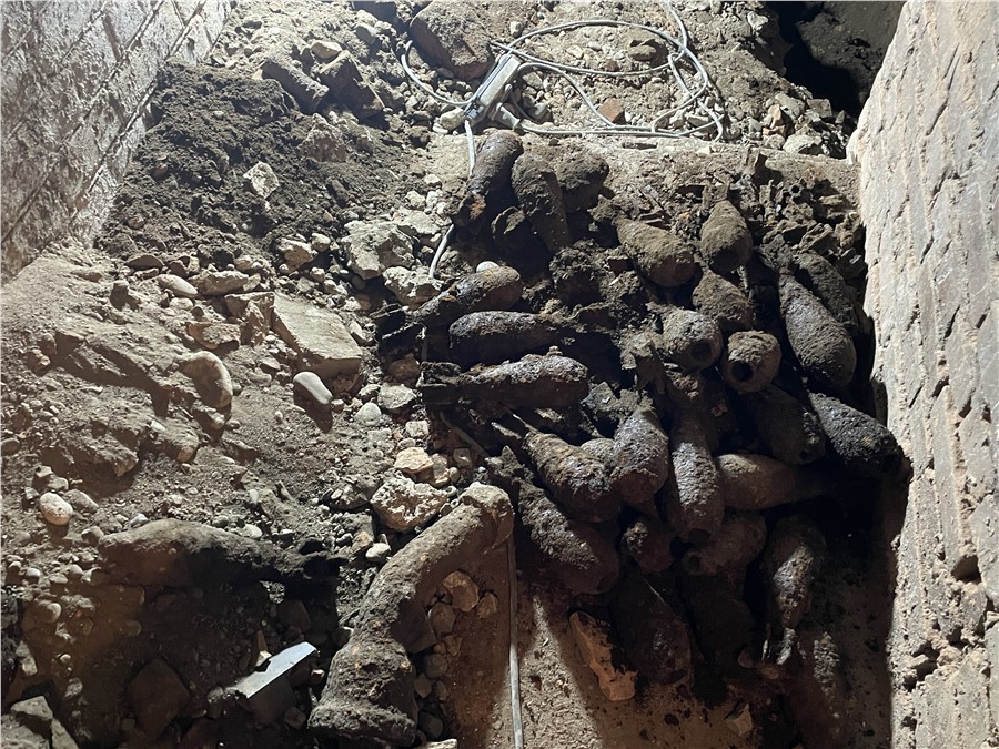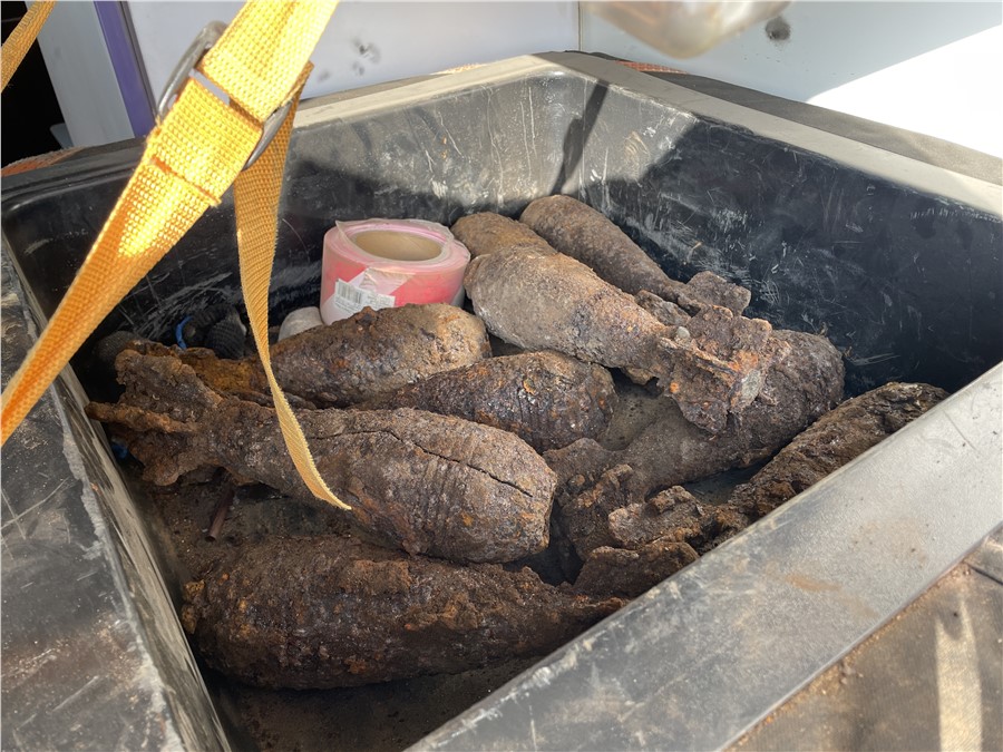 На место раскопок незамедлительно приехала группа разминирования ОМОН. Специалисты взрывотехники провели обследование и установили, что было обнаружено 11 боевых минометных мин калибра 82 мм. с элементами коррозии и со взрывчатым веществом, а также 22 корпуса от мин аналогичного калибра и без взрывчатого вещества.