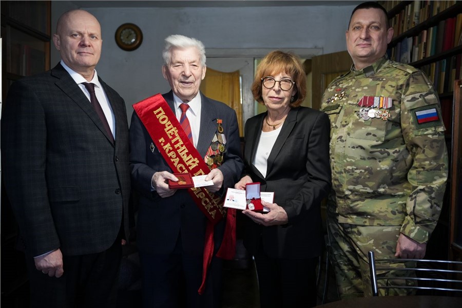 В преддверии праздника фронтовика навестили мэр Владислав Логинов и председатель Красноярского городского Совета депутатов Наталия Фирюлина. Вместе с заместителем председателя «Союза ветеранов специальной военной операции» Алексеем Гладышевым они вручили ветерану ВОВ знаки отличия звания «Почетный гражданин города Красноярска» и памятную медаль 80-летия Победы.