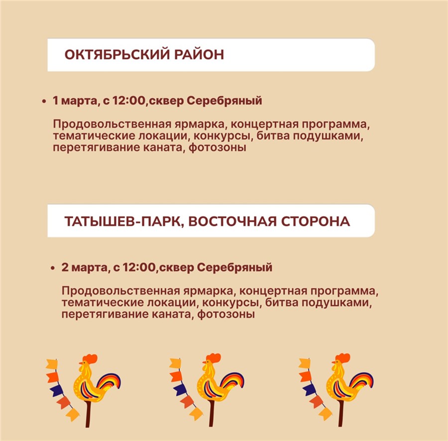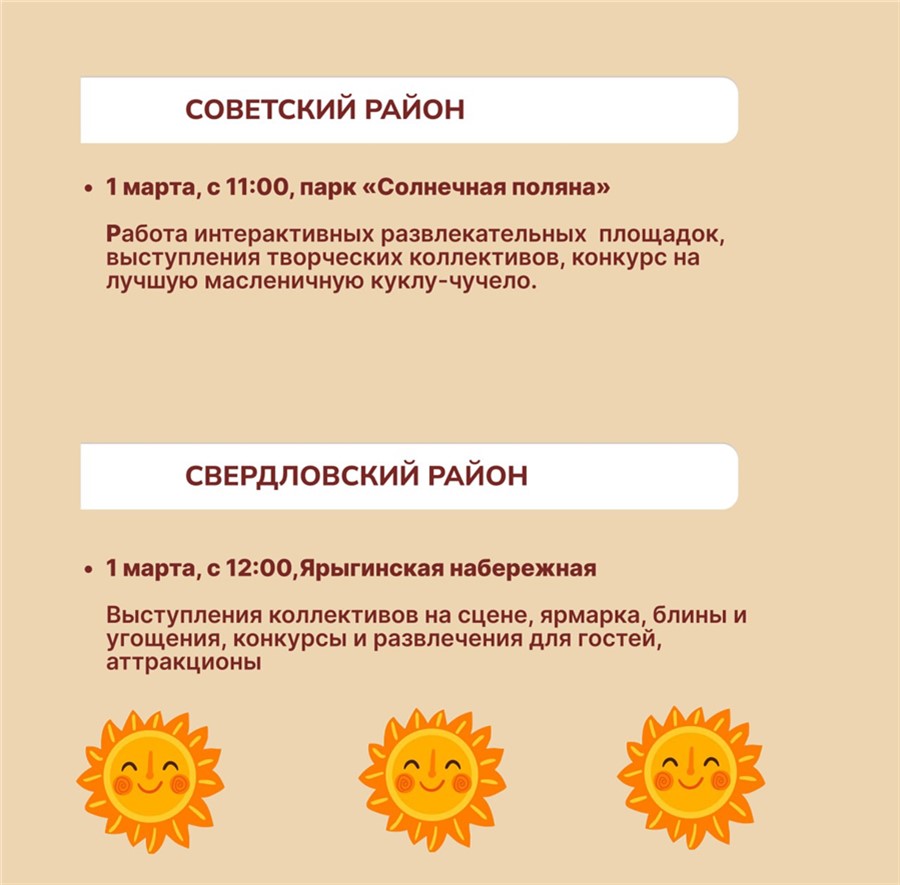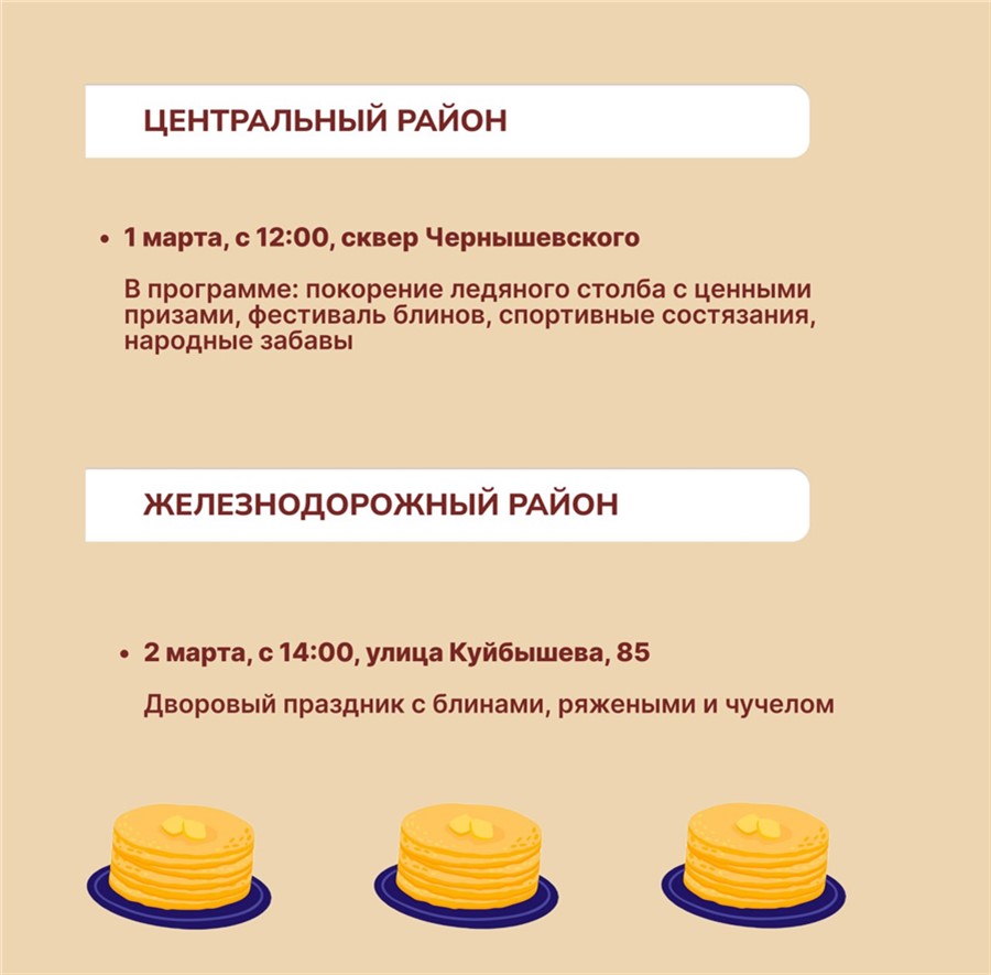 Также Масленицу отметят в районах города: 1 марта — на Ярыгинской набережной, в сквере Чернышевского и Серебряный, в парке «Солнечная поляна»; 2 марта — в Железнодорожном районе во дворе по ул. Куйбышева, 85. На площадках гостей ждут: викторины, аттракционы, торговые ряды с угощениями, продовольственные ярмарки, выступления творческих коллективов, спортивные конкурсы, народные забавы (битва подушками, перетягивание каната) и тематические мастер-классы.