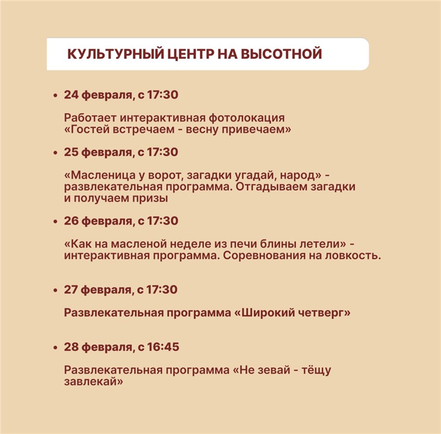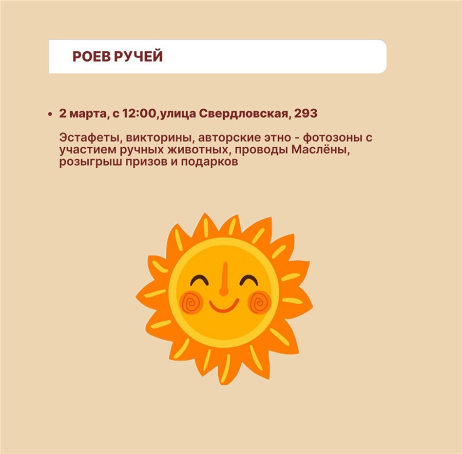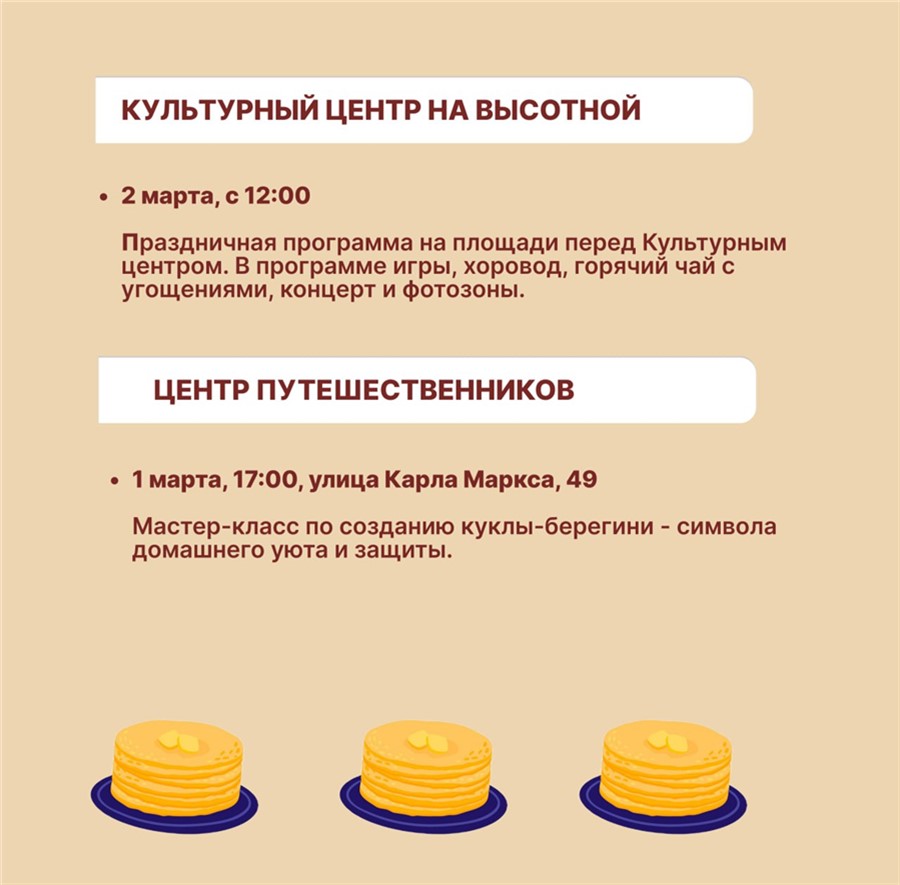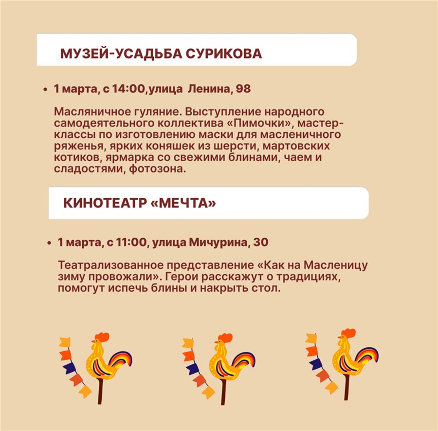Кроме того, масленичные гуляния пройдут в городских учреждениях: 1 марта — в кинотеатре «Мечта», музее-усадьбе В. И. Сурикова и в «Центре путешественников». 2 марта красноярцев ждут на проводы зимы на площади перед Культурным центром и в парке флоры и фауны «Роев ручей».
