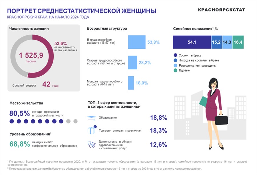 По данным статистиков, в Красноярском крае проживают 1,5 млн женщин — это 53,6 % от общей численности населения региона. Больше половины (53,8 %) — трудоспособного возраста, 18 % — моложе, 28 % — на пенсии. Средний возраст женщин края — 42 года. К началу 2024 года вековой рубеж перешагнули 98 женщин.