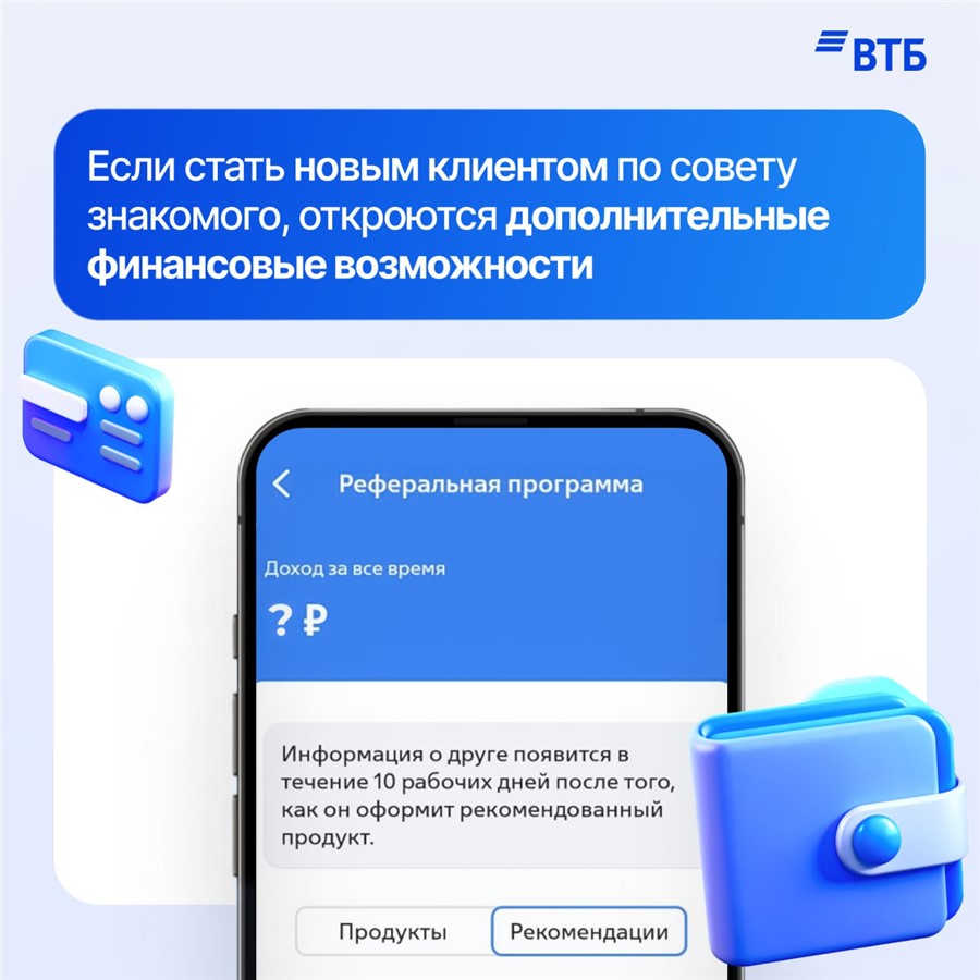 - Если у близкого пока нет карты ВТБ, можно прислать ему ссылку на форму для ее оформления прямо из онлайн-банка. Если стать новым клиентом по совету друга или родственника и сделать первые покупки — и новому пользователю, и его рекомендателю будет начислено материальное поощрение.