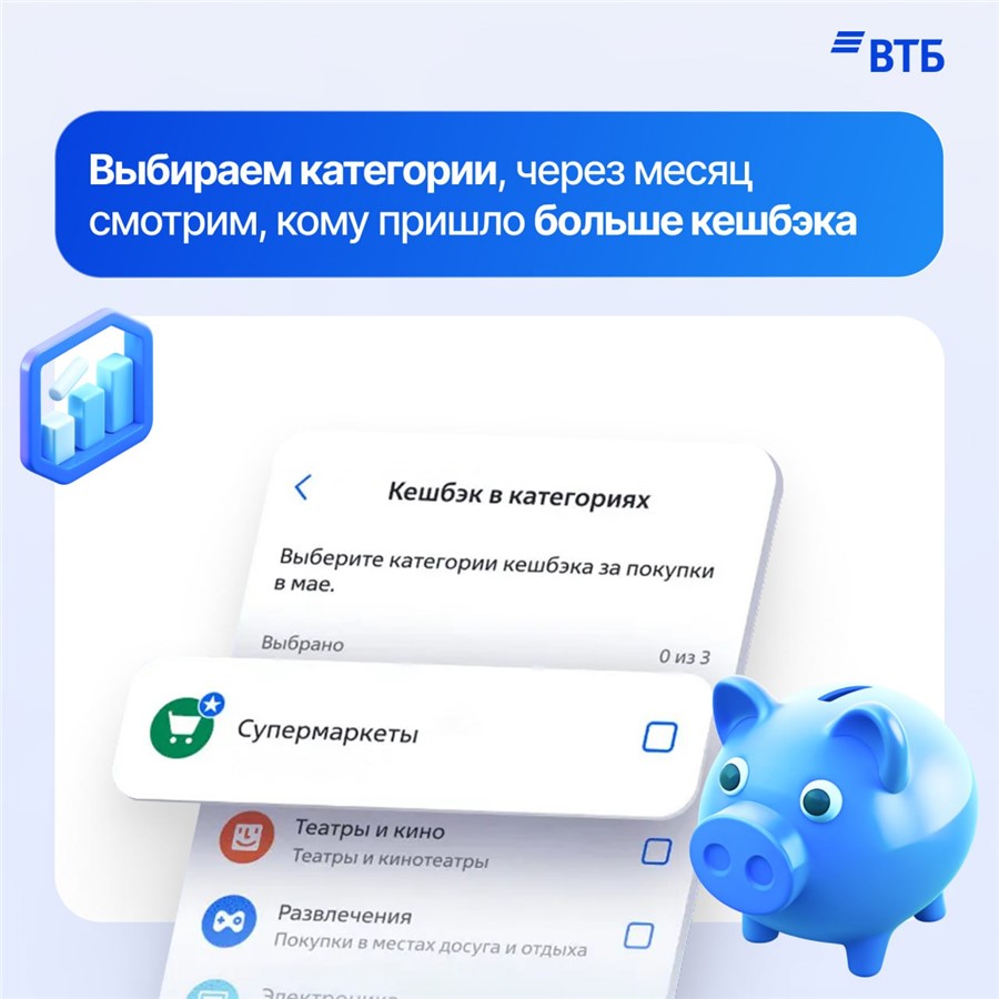 - Традиционный кешбэк — тоже в копилку. У каждого владельца карты ВТБ — 3-4 категории кешбэка а месяц, на семью из 3-х человек — категорий будет уже 10. Чтобы получить больше кешбэка, выбирать лучше разные категории и оплачивать покупки тем участникам группы, у которых по ним больше возврат. Не забываем выбирать категории в конце каждого месяца. В начале следующего — сравниваем, кому банк вернул больше.