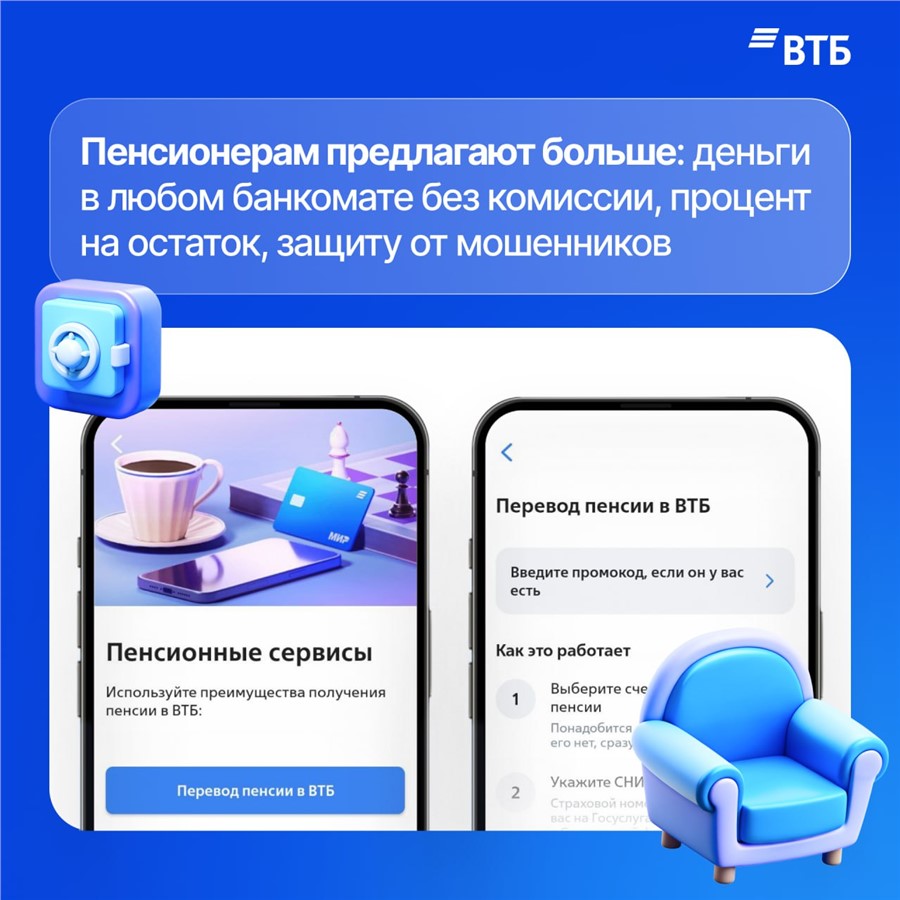 - Старшим — почет и уважение. Если пенсию перевести в ВТБ, то снимать деньги без комиссии можно будет в любом банкомате, а еще банк выплатит процент на остаток на карте и бесплатно застрахует от мошенничества.