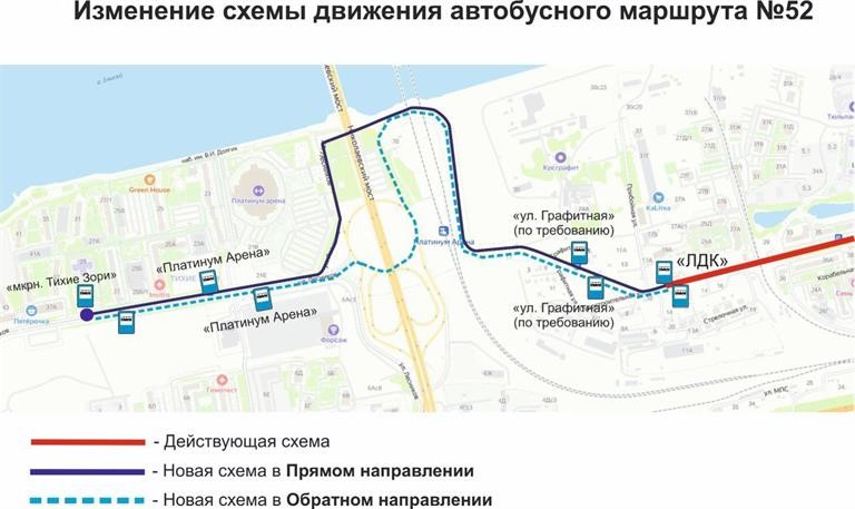 Перевозить пассажиров будут автобусы маршрута № 52. Его схема движения продлена: вместо конечной остановки «ЛДК» автобусы будут завершать маршрут на остановке «Тихие зори» у разворотной площадки по улице Лесников, 37а. В схему добавили три остановки: «Микрорайон Тихие Зори», «Платинум Арена» и новая остановка «Графитная», на которой посадка-высадка пассажиров будет осуществляться по требованию.
