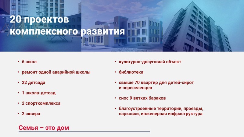 Владислав Логинов в докладе затронул и тему комплексного развития территорий. Сейчас в городе реализуется 20 таких проектов. Благодаря им в Красноярске появятся 6 школ, 22 детсада, комплекс школа/детский сад, два сквера, спортобъекты, больше 70 квартир для детей-сирот и переселенцев, проезды, парковки и другая важная инфраструктура.