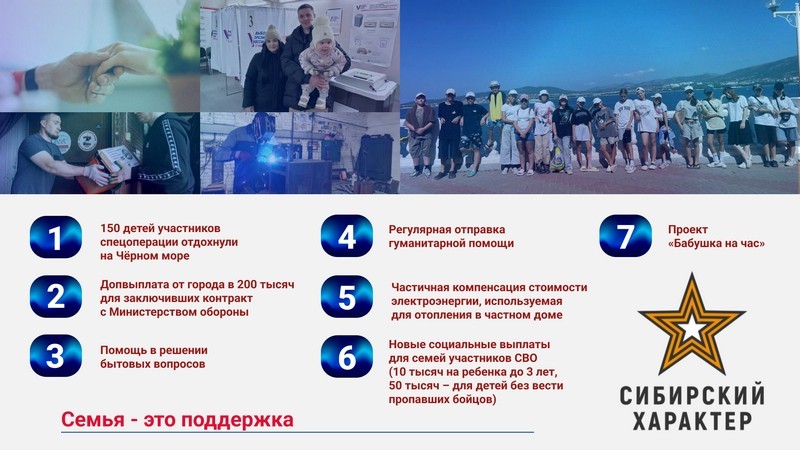 Владислав Логинов напомнил и о других мерах поддержки для участников СВО. Например, в 2024 году впервые 150 детей участников спецоперации из Красноярска бесплатно отдохнули на Черном море. Кроме того, появились новые соцвыплаты для детей участников спецоперации: 10 тыс. рублей на ребенка до 3 лет и 50 тыс. рублей — для ребятишек без вести пропавших бойцов.