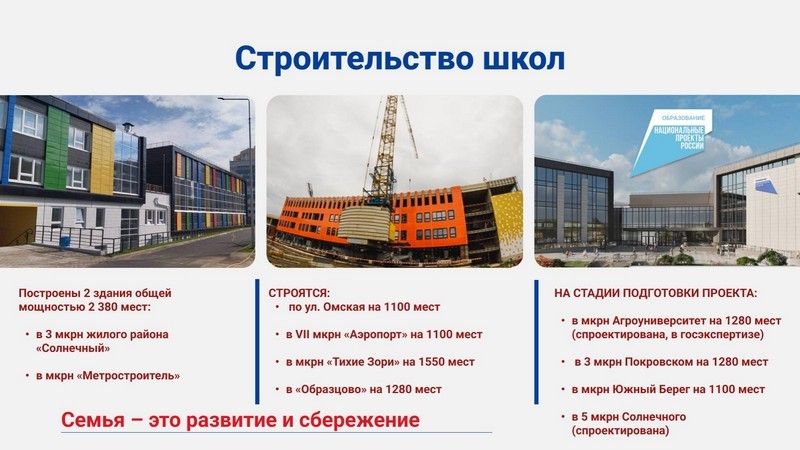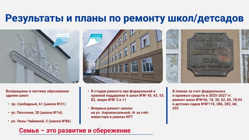 Также глава города в докладе рассказал о реализации нацпроектов. Красноярск продолжают обеспечивать новыми школами. Так, четыре образовательных учреждения строятся на Омской, в «Тихих Зорях», «Мичуринском» и микрорайоне «Аэропорт». Еще три проектируются — в микрорайоне Агроуниверситет, Покровском и на Южном Берегу. Шесть школ сейчас находятся на ремонте. Их открытие намечено на 1 сентября. Больше 8 тыс. детей вернутся в родные школы.
