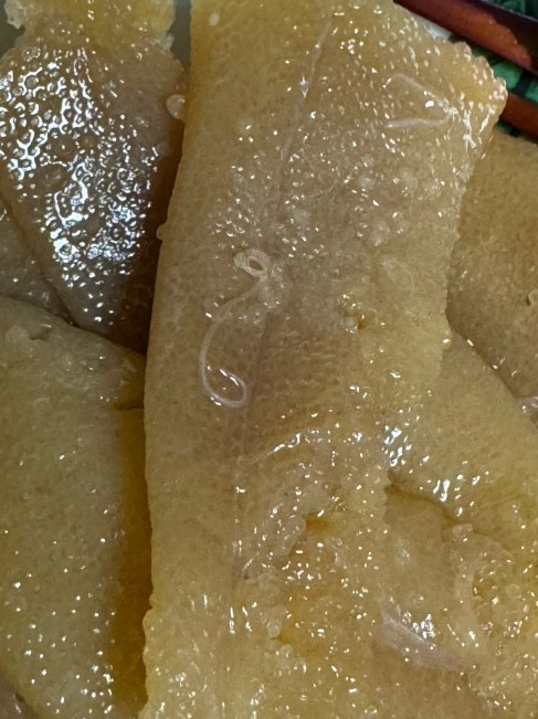 Специалисты определили, что в продукции визуально усматривались «нежизнеспособные паразиты белого цвета, скрученные в спираль, предположительно личики анизакиды».
