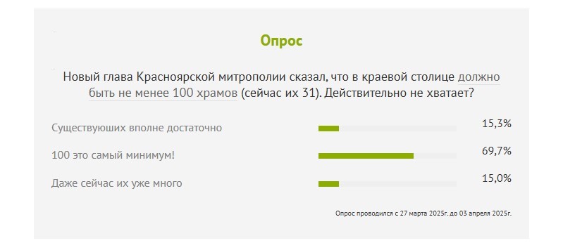 В исследовании приняли участие 1 360 человек, голосование проходило на сайте Newslab. В рамках опроса выяснилось, что большая часть респондентов (69,7 %) считает, что в краевой столице должно быть минимум 100 храмов.
