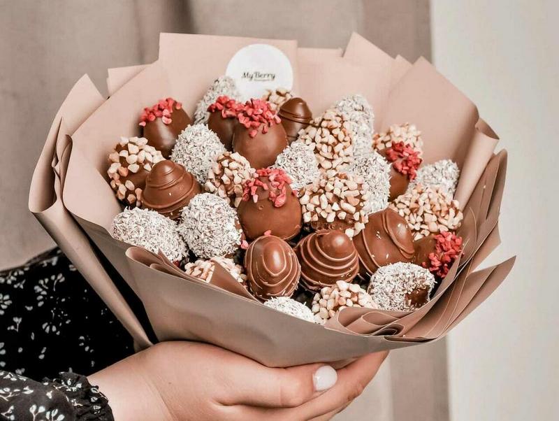 Зефир и конфеты ручной работы. Свежий ароматный яблочный или апельсиновый зефир можно упаковать в коробку и приложить открытку — классический вариант. Хотите удивить? Закажите букет пионов или тюльпанов из зефира. От настоящих не отличить, а аромат так и манит.