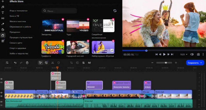 - Готовые шаблоны и эффекты. Программа включает в себя музыку, переходы, титры и фильтры.