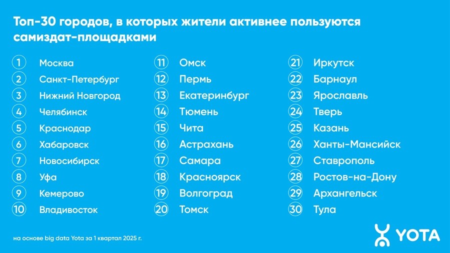 Больше всего самиздат-сервисами пользуются жители Москвы, Санкт-Петербурга и Нижнего Новгорода. В топ-10 по среднему трафику на пользователя также вошли Челябинск, Краснодар, Хабаровск, Новосибирск, Уфа, Кемерово и Владивосток. Традиционные онлайн-библиотеки наиболее популярны в Москве, Санкт-Петербурге, Уфе, Казани, Новосибирске, Краснодаре, Самаре, Екатеринбурге, Кемерово и Челябинске.