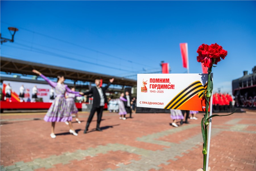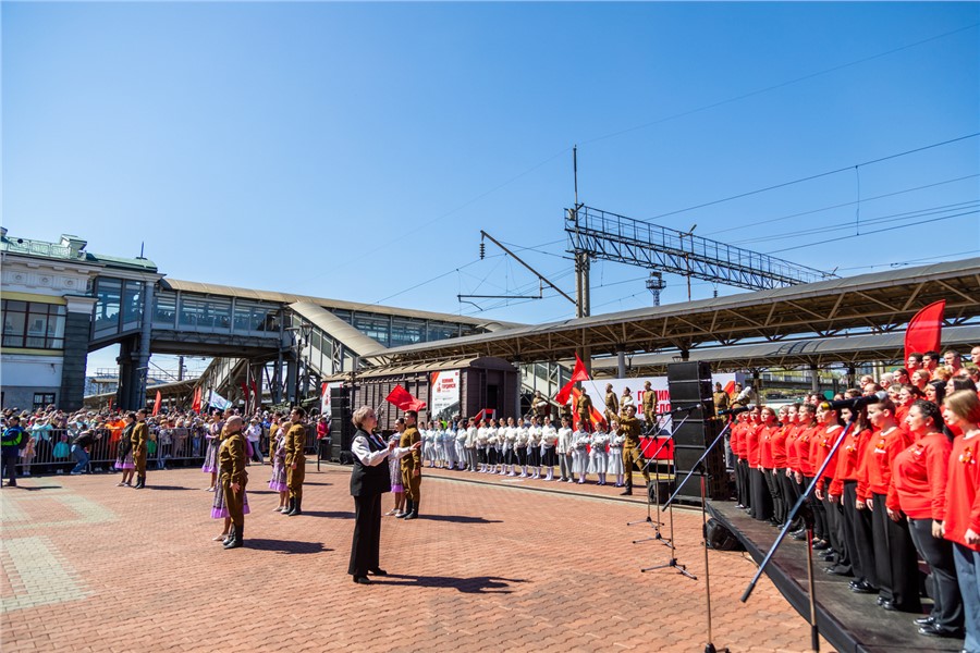 Воинский ретроэшелон прибыл на станцию Красноярск под главную песню о войне — «День Победы» — в исполнении большого сводного хора Красноярской магистрали, объединившего 80 железнодорожников.
