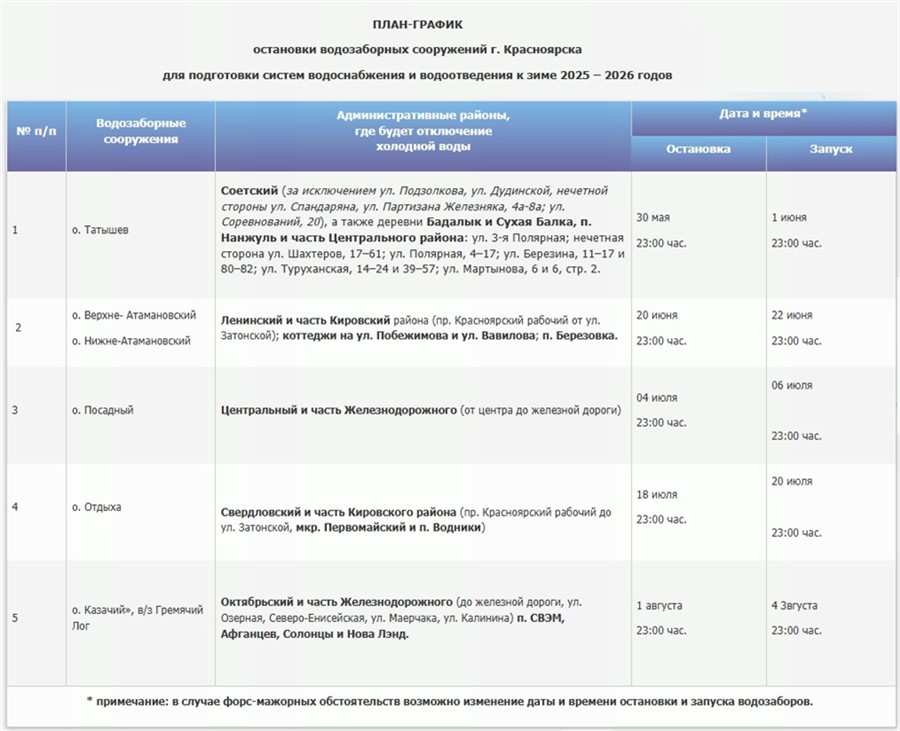 в «КрасКоме» отметили, что в случае форс-мажорных обстоятельств возможно изменение даты и времени остановки и запуска водозаборов.