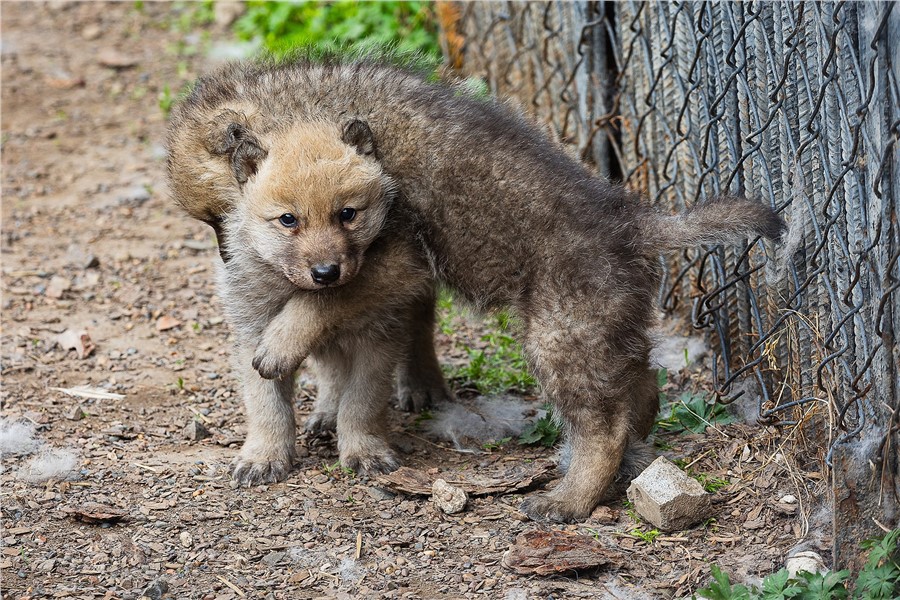 В красноярском «Роевом ручье» месяц назад у пары арктических волков Олава и Бланки родились три волчонка. Сейчас они все чаще вылезают из логова, у них открылись глаза и уже прорезались зубы.