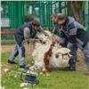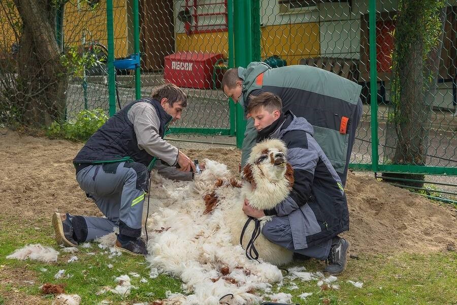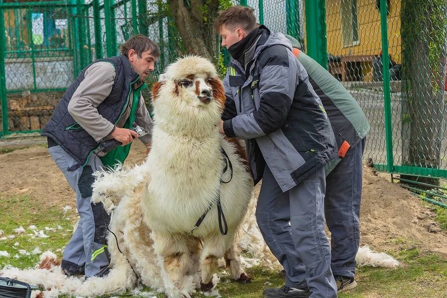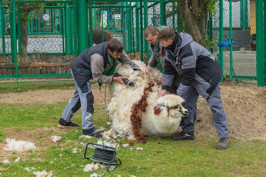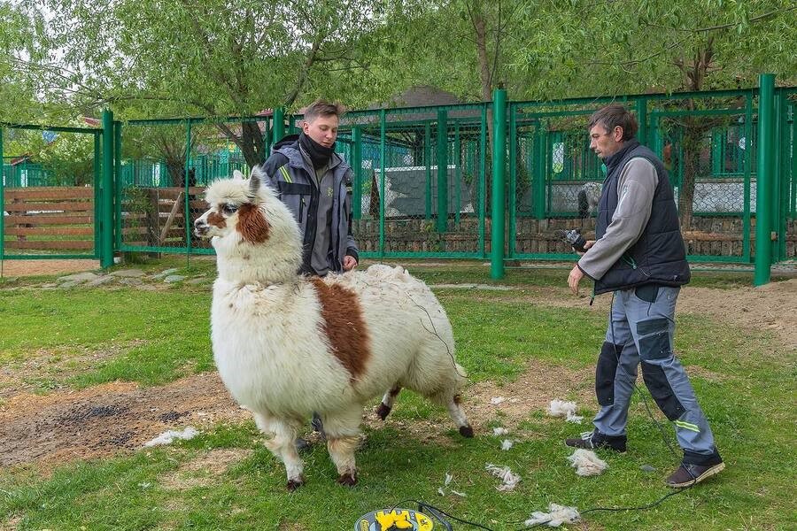 В красноярском «Роевом ручье» показали традиционную стрижку альпака. Фотографиями поделилась пресс-служба парка флоры и фауны.