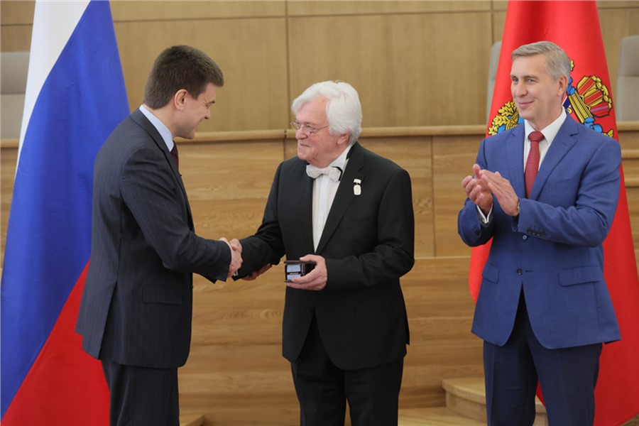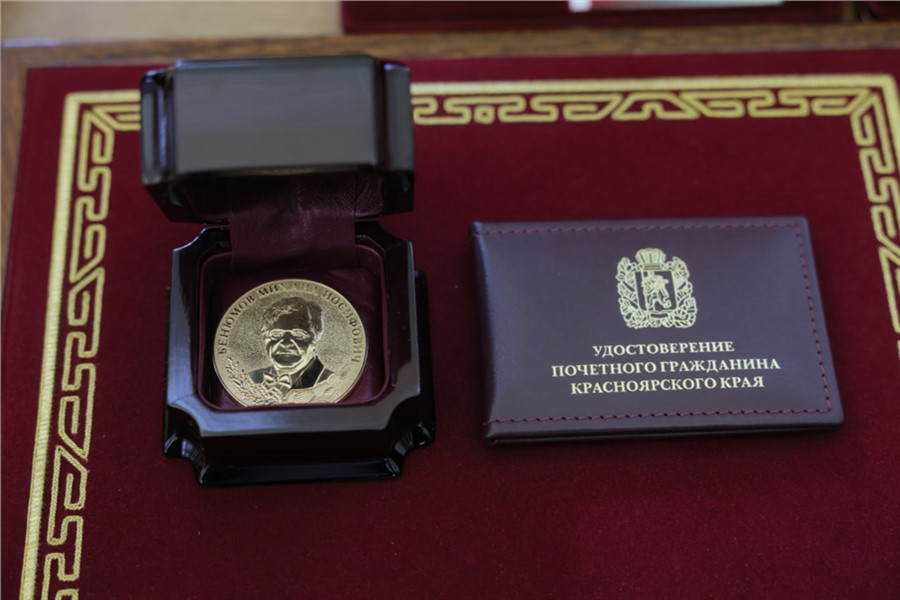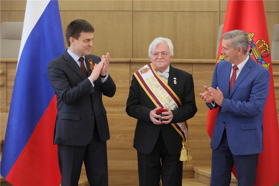 Атрибуты звания «Почетный гражданин Красноярского края» — удостоверение, медаль, нагрудный знак и ленту — выдающемуся музыканту вручили руководитель региона Михаил Котюков и спикер Законодательного Собрания края Алексей Додатко.
