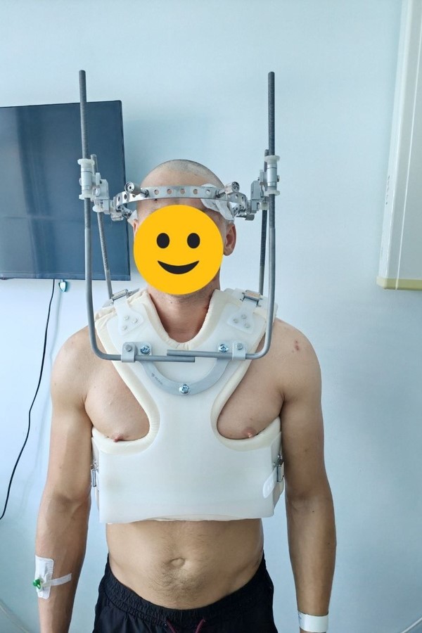 Ныряльщику с поврежденным первым шейным позвонком установили систему гало-фиксации. С этой конструкцией ему предстоит ходить до трех месяцев.
