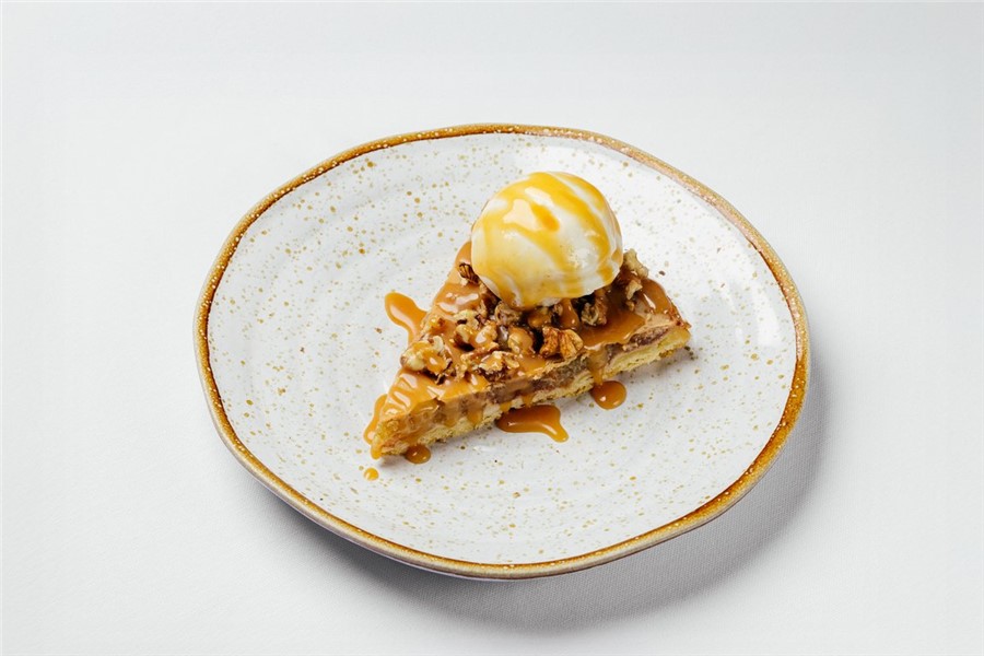 - тонкий яблочный пирог с карамельным соусом и ванильным джелато.