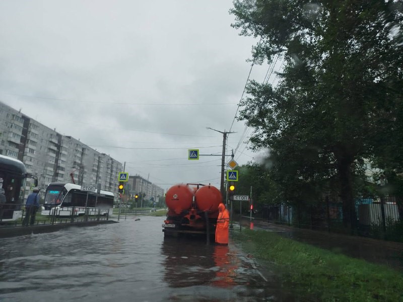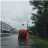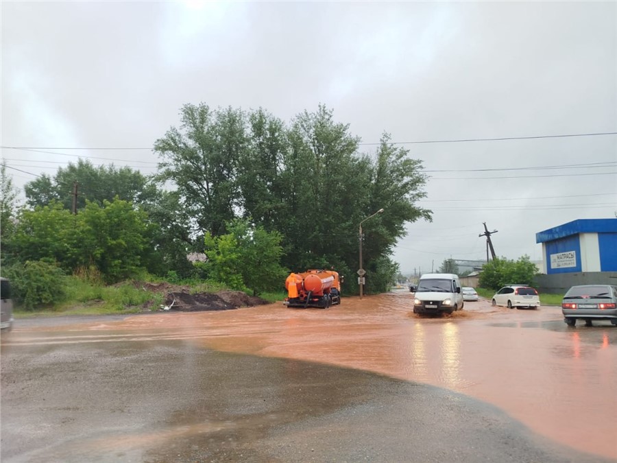 В некоторых районах Красноярска из-за непрекращающегося с ночи дождя подтопило дороги — местами ливневки не справились и потребовалась откачка воды.