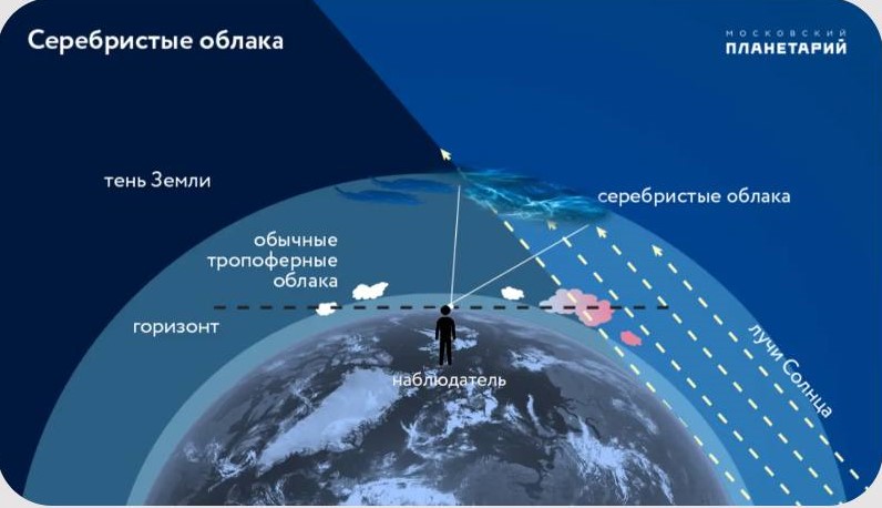 Это самые высокие облачные образования в земной атмосфере, возникающие на высотах 70-95 км. Их называют также полярными мезосферными облаками или ночными светящимися облаками.