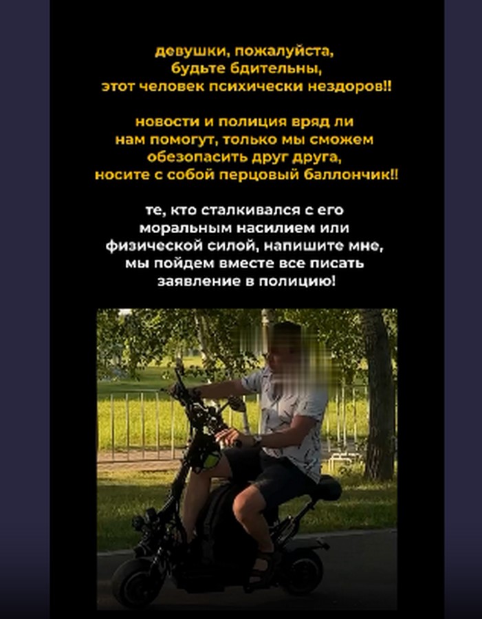 «Вечером на острове Татышев спокойно фотографировала. Ко мне подъехал на мотосамокате странный тип. Начал грубить, материть и унижать. Я послала его и уехала. Через минуту он догнал и сбил меня. Я была на велосипеде, успела только снять, как он уезжает», — рассказала в соцсетях одна из пострадавших.