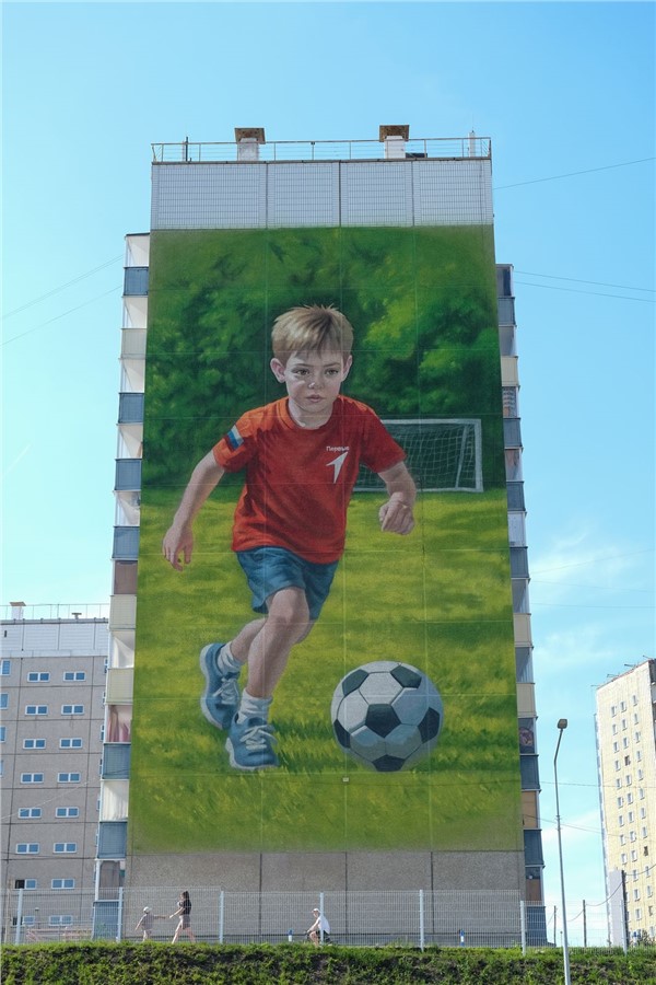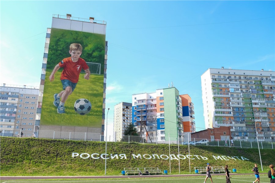 В красноярском микрорайоне Солнечный художники закончили работу над муралом с юным футболистом, сообщила руководитель агентства печати и массовых коммуникаций Красноярского края Ирина Брежнева.