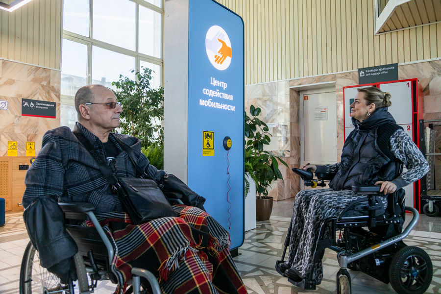 Сотрудники встречают и сопровождают пассажиров с инвалидностью, помогают оформлять проездные документы, сдать багаж и сесть в поезд. При необходимости предоставляются кресло-коляска или каталка для лежачих больных. Все услуги оказываются бесплатно.